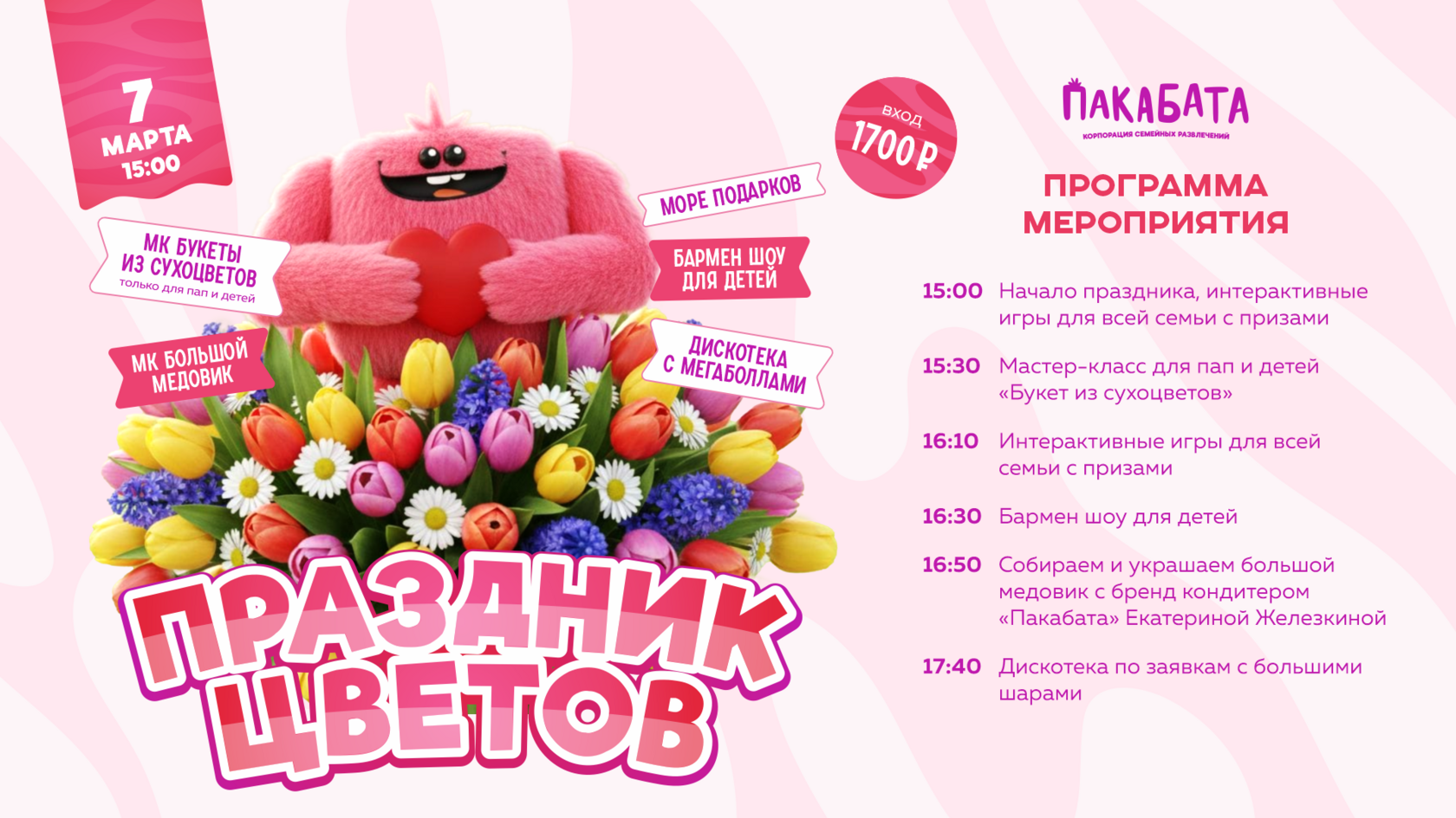 7 марта в 15:00 в ПакаБата состоится яркий весенний Праздник цветов — событие для всей семьи с мастер-классами, интерактивами и праздничной атмосферой.